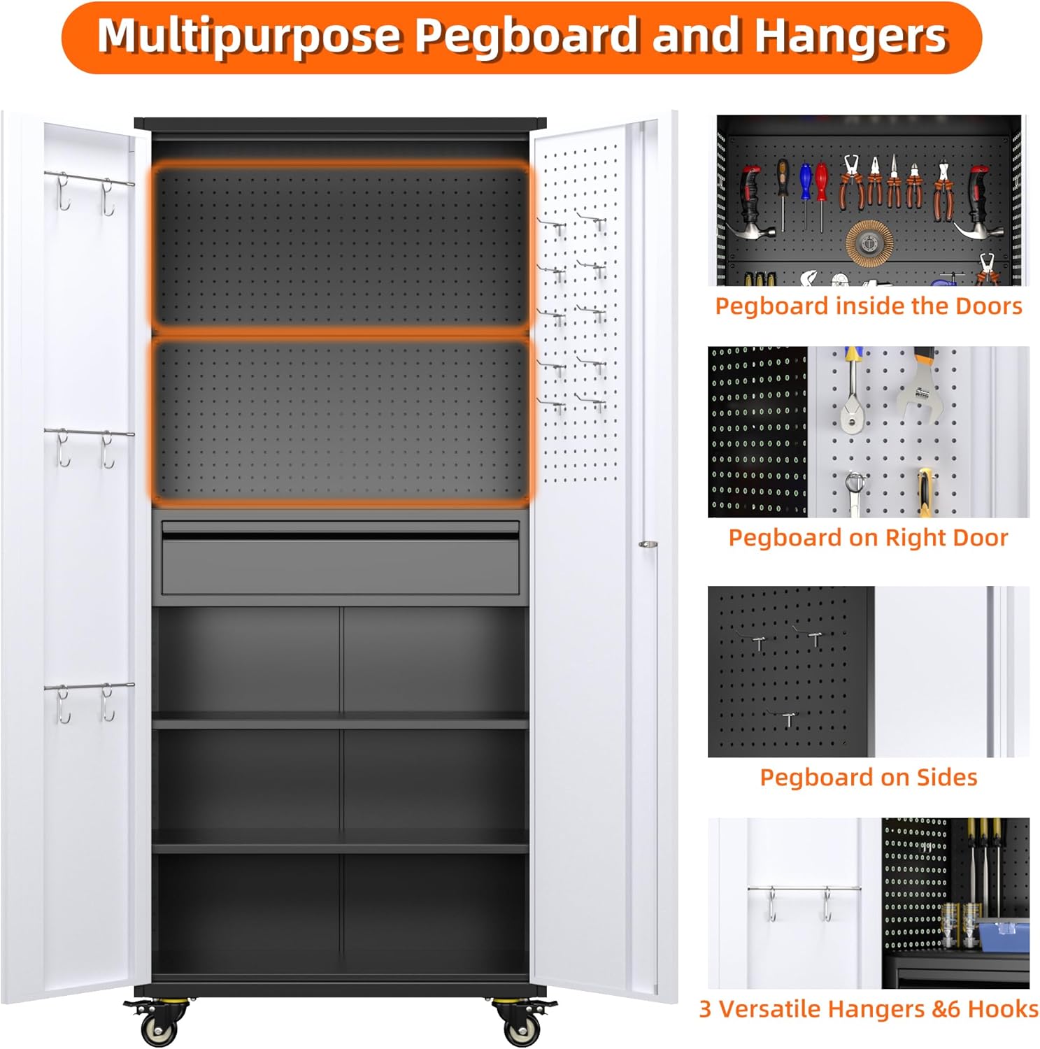 - ใUpgraded Design & More Spaceใ Storage cabinet offers plenty of space to meet your storage needs. There are pegboard on the cabinet right door and 2 Sides. The left door has a hanging rod and 6 small hooks. Open the door and inside there is a big drawer