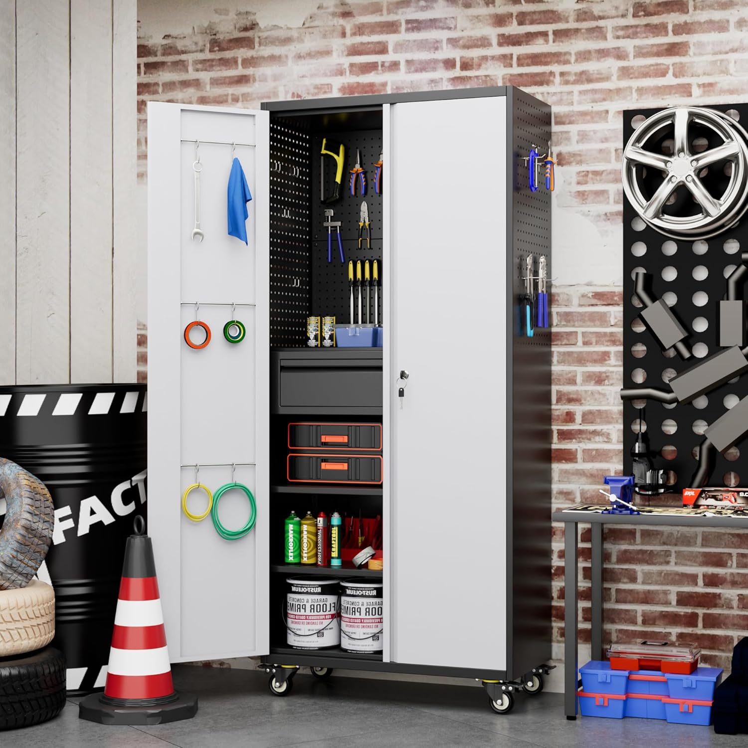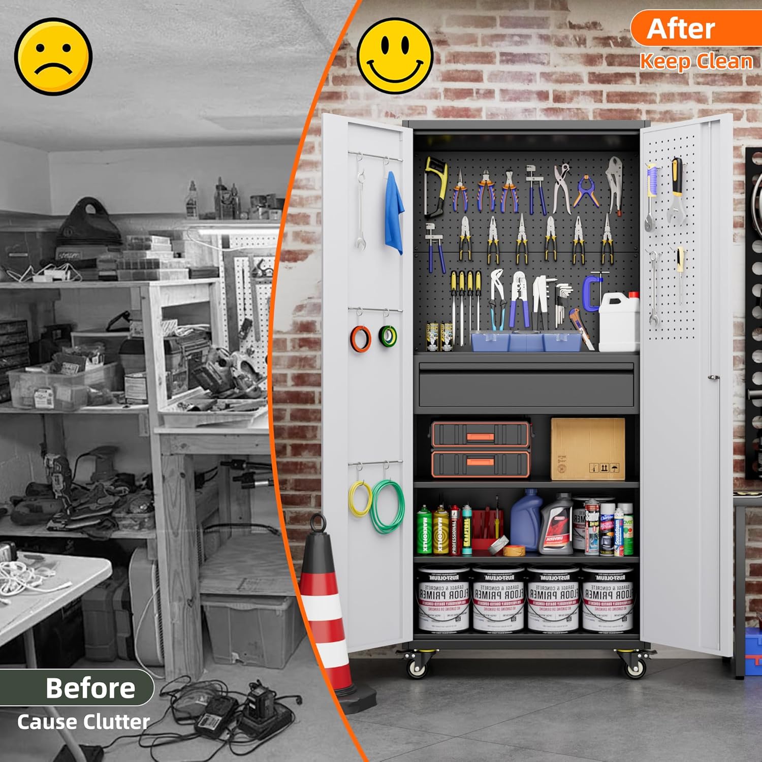 - ใ2 Adjustable Shelves and Pegboardsใ Locking cabinet on wheels has 2 adjustable shelves and pegboards. The shelves can be adjusted up and down to the desired position for your household items, tools, and other items. When you do not want to use the hole plate in the back to hang the item, you can lay it flat as a partition to place the item