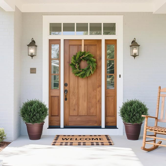 - Faux Outdoor Plants: This set includes 2 artificial cedar topiary trees, perfect for adding a touch of elegance to your porch, garden, or any indoor/outdoor space. Each tree stands 24.5" tall and comes with a ground spike for easy placement. (Tips: Fluff the leaves after unpacking for the best look!)