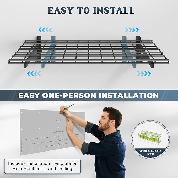 - 📦【All-in-One Mesh Storage】- The seamless welded mesh design securely holds tires, sports gear, toolboxes, and plastic bins without sagging. Open-grid airflow prevents dust buildup, while the anti-rust coating ensures durability in humid garage environments.
