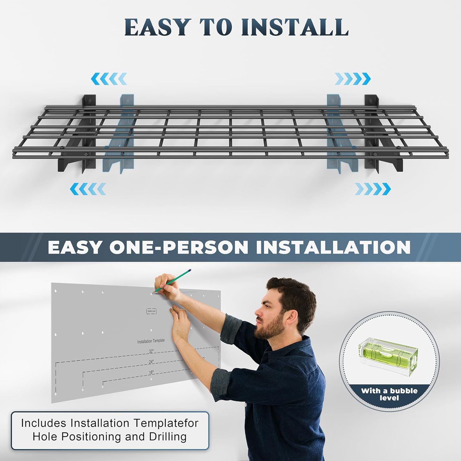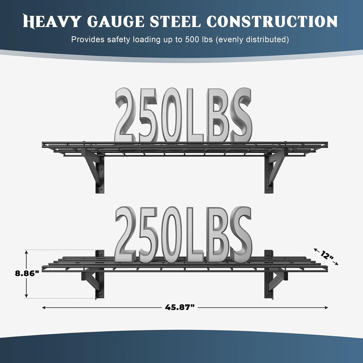 - ๐ใHeavy-Duty Load Capacityใ- Jusgym garage shelving wall mounted system is engineered with premium steel, offering exceptional strength. Each 1x4ft bracket holds up to 250 lbs, and with 2 shelves totaling 500lbs capacity, it effortlessly stores bulky items like tools, tires, and heavy storage bins. Built to last, even under extreme weight!