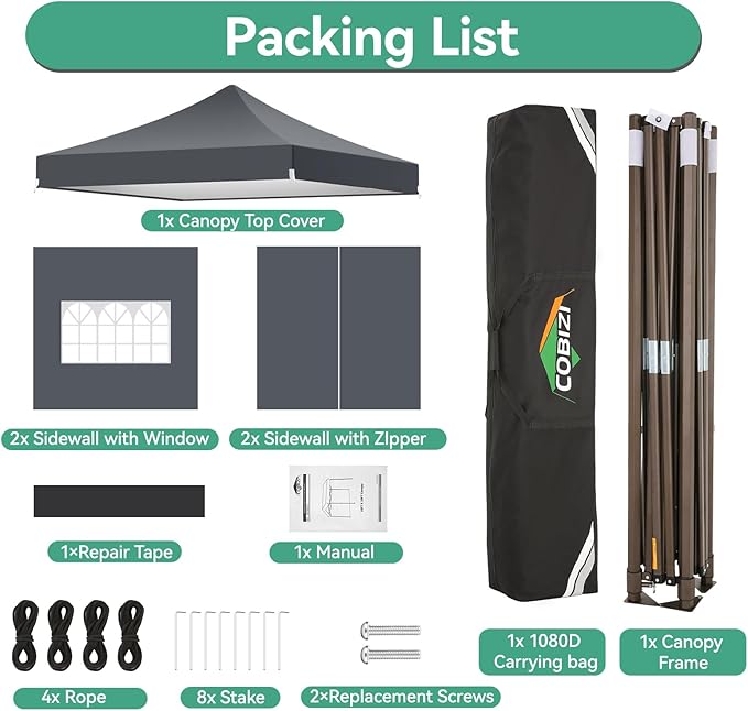 - [Included Accessories, Warranty Service] 1x Commercial Grade 10x10 Pop Up Tent Frame, 1x 420D Top Cover, 2x window sidewalls, 2x zipper door sidewall, 8x Ground Pegs, 4x Windproof Ropes, 1x Hand Bag, 1x Manual.We provide 1 year warranty service. If you have any problems and questions, please feel free to contact us, we will give you the best help. Choosing us means choosing a comfortable life.