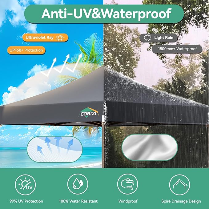 - [Premium Quality Fabric] 10x10 pop up canopy tent is made of 420g waterproof oxford fabric. The top fabric is coated with two layers of PVC with heat-sealed seams waterproof strip technology, 100% waterproof and blocks 99% UV rays.PVC coated top fabric has better light transmission than other silver coated top fabrics on the market, the tent space is more transparent.