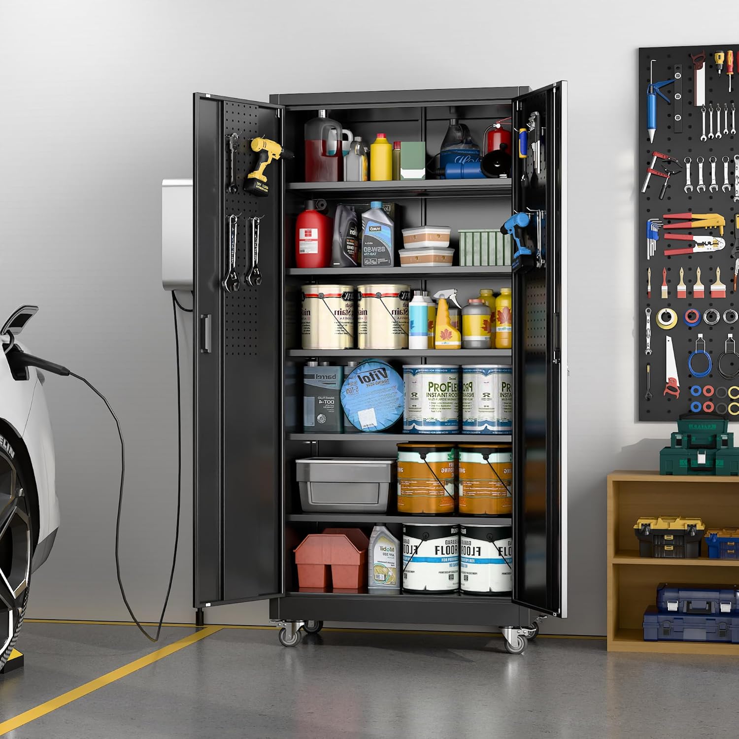 - Metal Storage Cabinet : Metal storage cabinet has 5 adjustable and removable shelves that can be adjusted while ensuring maximum adaptability and convenience to meet your own unique storage and organization needs. Metal storage cabinet have 2 round pegboards and 4 hooks, and if you need more you can easily buy more suitable hooks