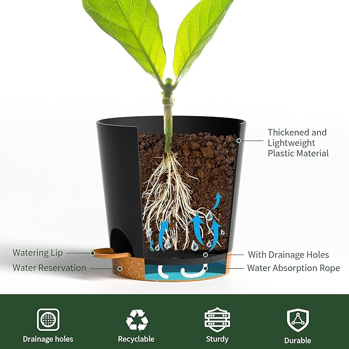 - Self-Watering Planter System: Our 4 inch small self watering plant pots feature a built-in wick rope that draws water from the reservoir, ensuring consistent hydration for your indoor and outdoor plants. Perfect for busy plant owners and those who forget to water!