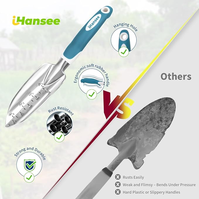 - Durable and Rust-Resistant Tools: Crafted from aluminum alloy, iHansee blue gardening tools are lightweight yet strong, offering long-lasting durability and rust resistance. Each tool has an ergonomic concave-convex handle made of PP+TPR for a comfortable grip. Designed to reduce strain on wrists and hands, the handles provide excellent leverage for digging, planting, and weeding.