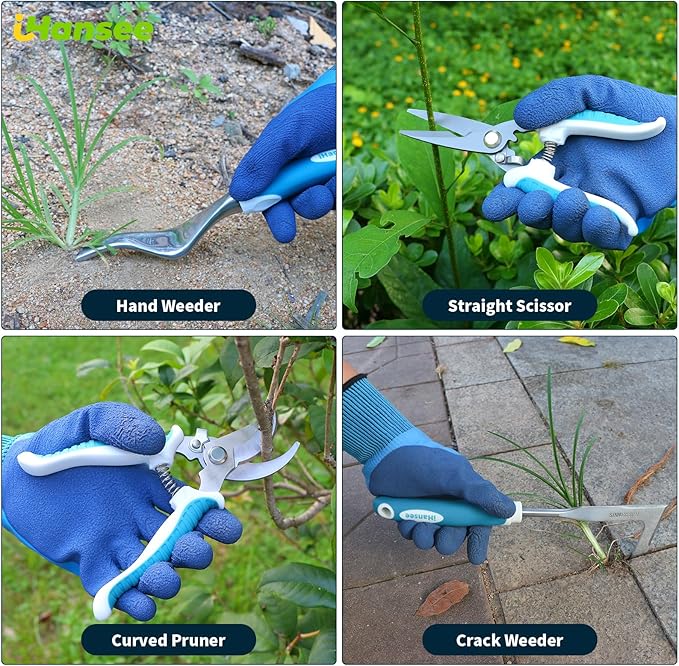 - Blue Garden Tool Sets 12-Piece: Includes blue gardening hand tools 8pcs(scissor, pruner, crack weeder, trowel, hand fork, hand rake, trans planter, hand weeder, along with gloves, a kneeling pad, garden apron, and a multi-pocket storage tote bag to keep everything organized