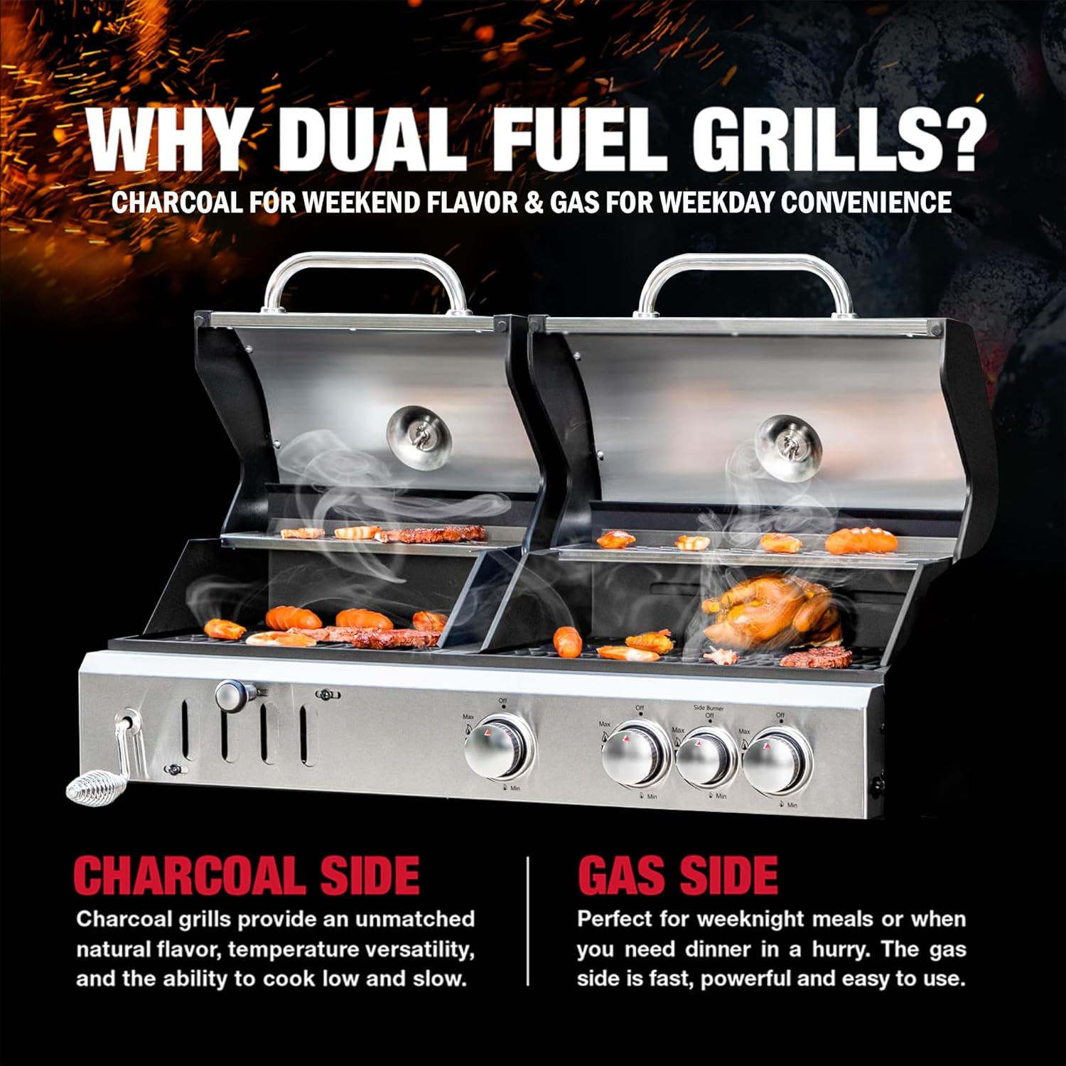 - COMBO GRILL: Gas and charcoal comb grill with additional side burner for ultimate cooking versatility. Can give you the rich, smoky flavor of charcoal or wood and the speedy convenience of gas in one tidy package. This dual fuel grill is a great option if you want to grill like a pro but canโt decide between a charcoal and a gas grill. You'll also conserve space on your porch or patio with one grill instead of two