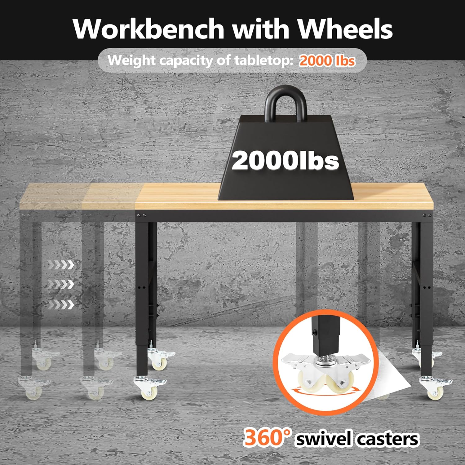 48” Adjustable Workbench,Heavy Duty Wood Work Bench 2000 Lbs Load Capacity,Work Table with Power Outlet and Wheels for Garage, Workshop, Office, Home