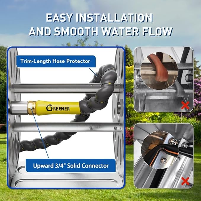 - HASSLE-FREE OPERATION - Say goodbye to tangled hoses and messy buildup! The GREENER garden hose reel wall mount comes with a hose auto-guide, Rubber-covered sharp edges and a Trimmable-length hose protector to ensure smooth, easy reeling, extending the life of your hose, saving you time and worry. Enjoy the convenience of a retractable hose that won't tangle or kink.