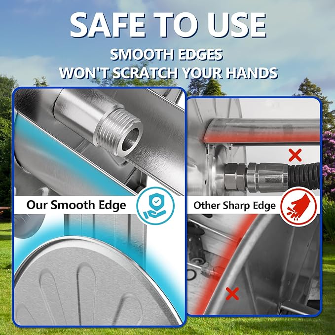 - DURABLE AND STYLISH DESIGN - Made of high-quality stainless steel, the GREENER garden hose holder ensures rust and corrosion resistance, extending its lifespan even in harsh outdoor conditions. Its sleek and modern design adds beauty to any outdoor space, and enhancing the overall well-organized garden or backyard. GREENER's garden hose reel that combines convenience, durability, and style. Have a try!