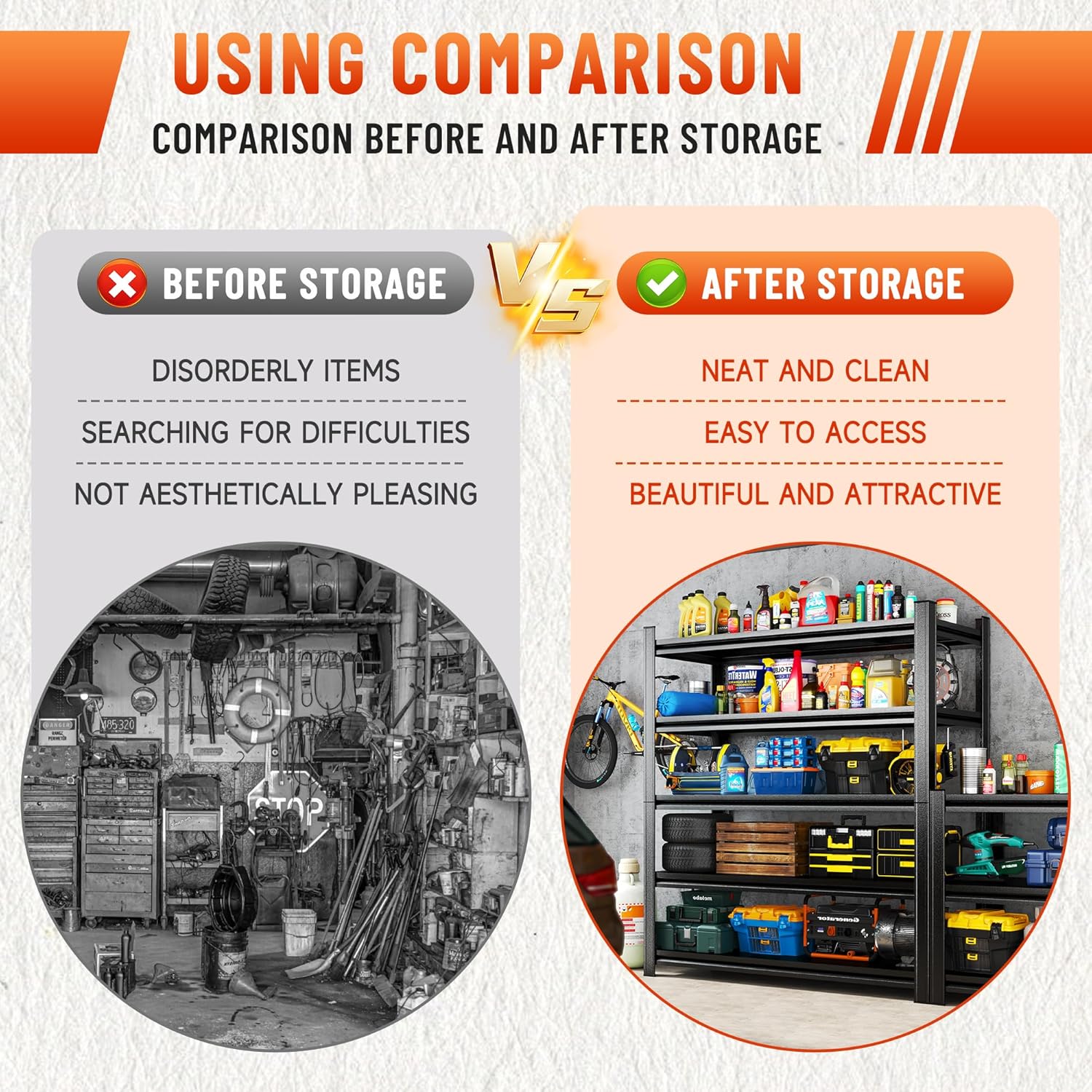 - ใFlexible Height Adjustment, Greatly Improve Space UtilizationใThis garage shelf can freely raise and lower the height of the five tiers of boards through the design of micro-adjustable slots, which can accurately match the different sizes of items from toolboxes and paint buckets to engines, containers and other items, and improves the utilization rate of each tier! The garage shelves are designed with tool-less adjustments, locking with the push of a finger, no need to remove bolts, and switching can be done in less than 30 seconds.