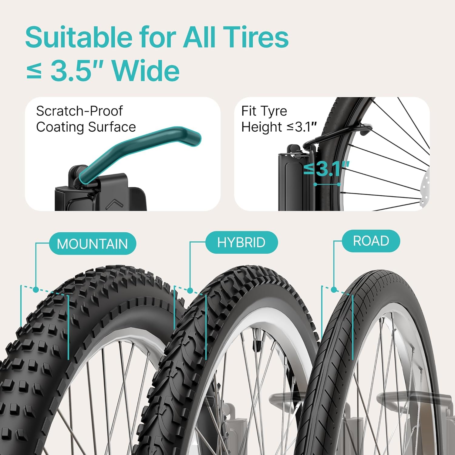 - 【Check Size】The moment you mount your bike on this garage bike mount, everything feels more organized. It accommodates mountain bikes, electric bikes, road bikes, hybrid bikes, city bikes, and even kids' bikes. Just ensure your tire height is under 3.15 inches and the width is less than 3.5 inches. Instantly, the bike rack wall mount transforms your entryway into a tidy, welcoming space where your bike is always within easy reach.