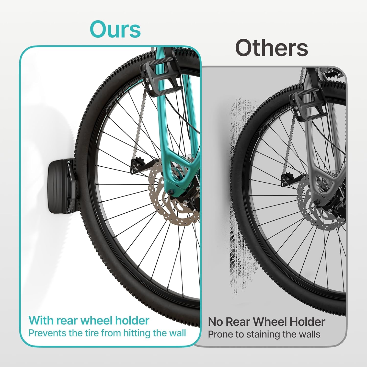 - 【Flexible Storage】Whether in a studio or garage, this bike wall hanger allows you to adjust your bike’s angle up to 65° at any time. This flexibility helps you maneuver around obstacles and park your bike in the most convenient position, eliminating space limitations and preventing cluttered hallways. Additionally, the bike hanger’s rear wheel stabilizer protects your walls from tire marks and dirt.