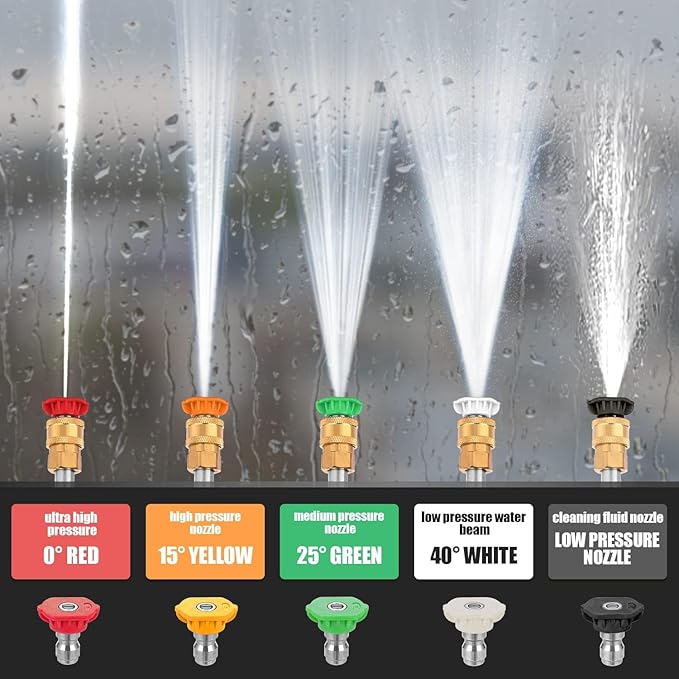 - Versatile Cleaning Options: The pressure washer includes 5 quick-connect nozzles (0ยบ,15ยบ, 25ยบ, 40ยบ, 60ยบ, and soap) to tackle different cleaning tasks, such as porches, driveways, patios, and even vehicles, providing flexibility for various cleaning needs.1L soap tank with adjustable switch-use to spray soaps and detergents.