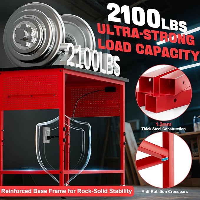 - Ultra-Stable 2100LB Heavy Duty Workbench with Reinforced Frame: This professional garage workbench features a patented bottom crossbar design that eliminates wobbling - unlike competing work tables that shake under load. The industrial-grade steel frame and MDF top deliver unmatched 2100lb capacity, making it ideal for workshop table applications requiring rock-solid stability