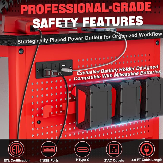 - ETL-Certified Power Hub with Modern Charging (2AC + 1USB-A + 1USB-C): Stay productive with the built-in power strip featuring 4.9FT cord length. Perfect for workbenches for garage use, it safely powers tools while the USB-C port future-proofs your workspace. ETL certification guarantees worry-free operation