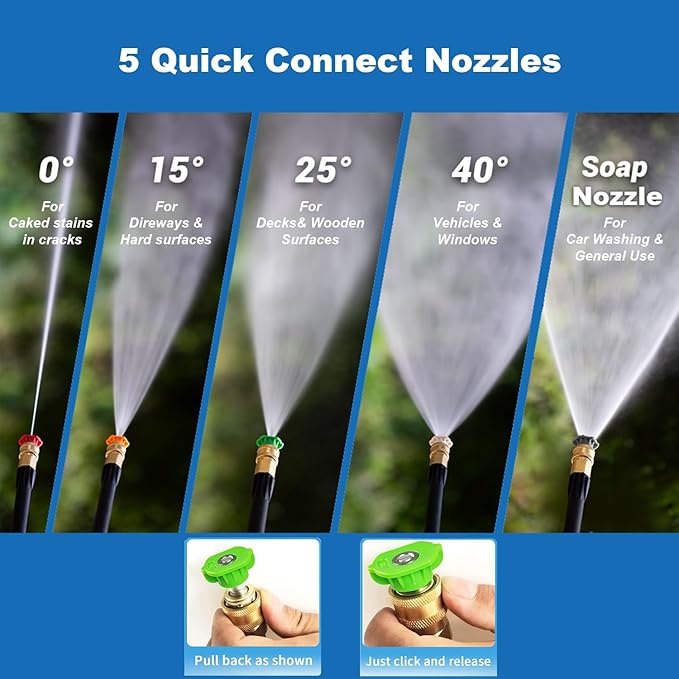 - UPGRADED ACCESSORIES: The Commowner portable pressure washer 2.0 comes with top-of-the-line accessories for a thorough cleaning experience; Navigate with ease using the 33-foot real rubber hose, choose from 5 QC nozzles (0ยฐ, 15ยฐ, 25ยฐ, 40ยฐ, soap) for different cleaning needs, and enjoy additional features like the 500ml detergent tank, metal lance, spray gun, cleaning pin, welcome guide and 20-foot electric cord
