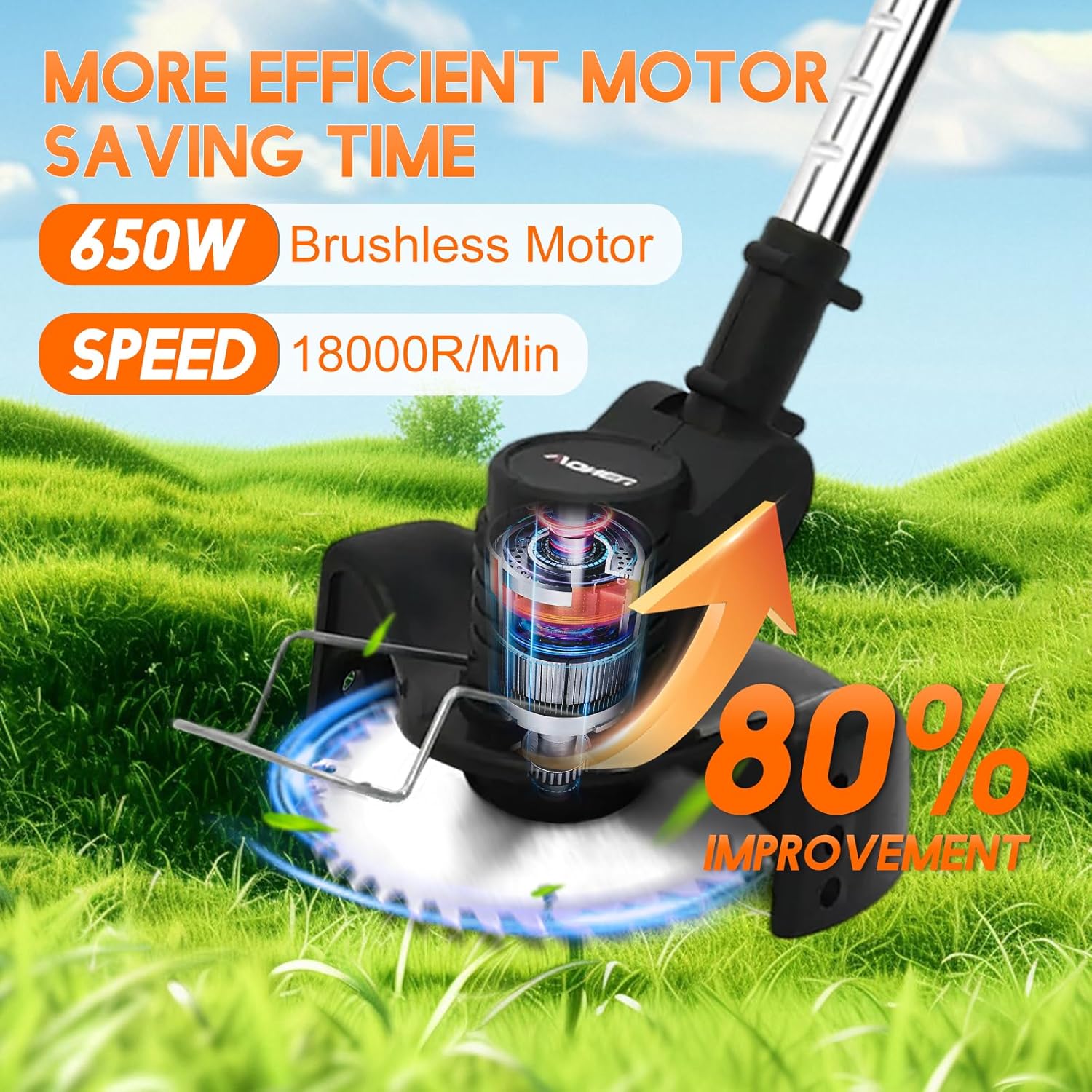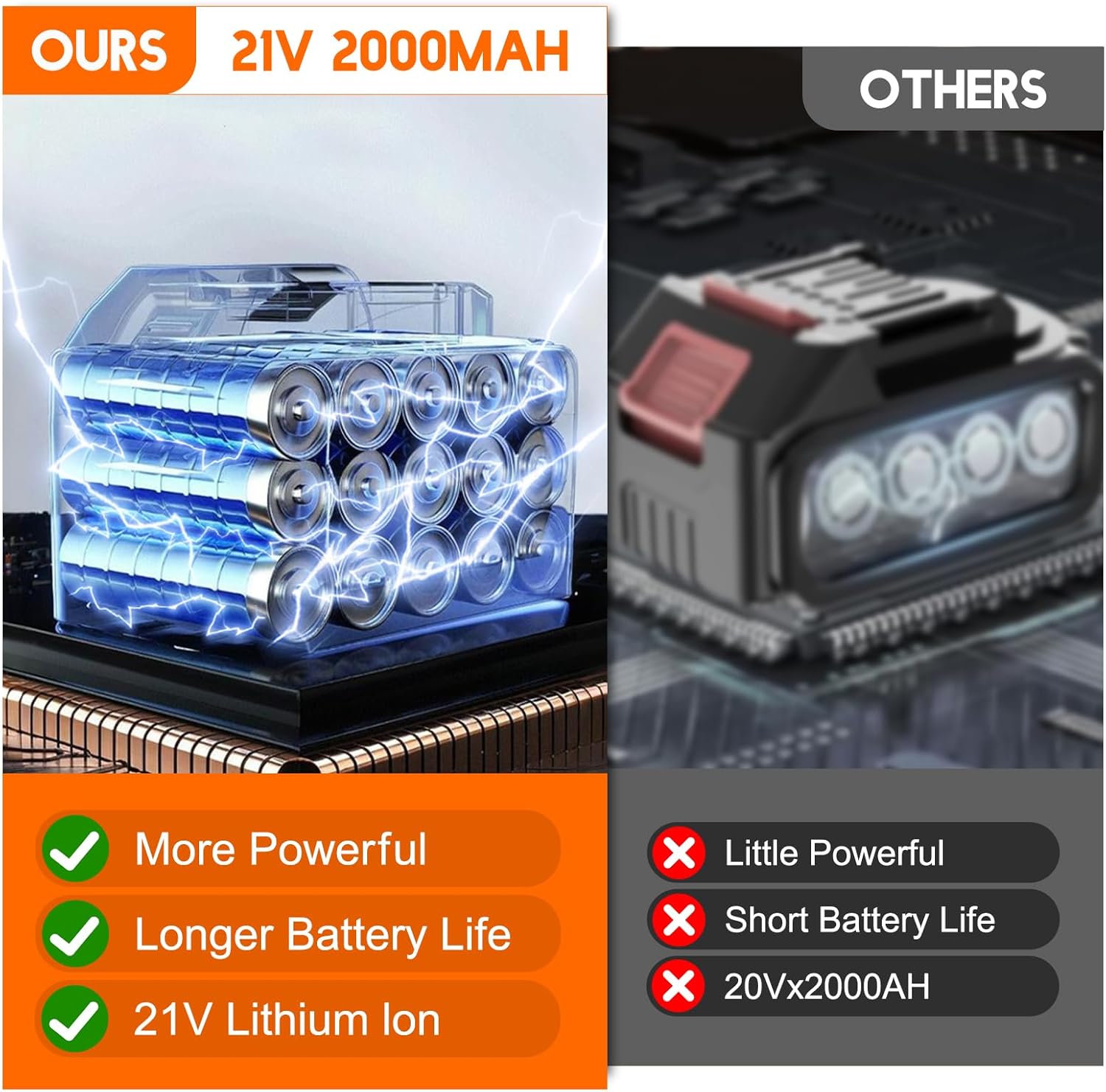 - Dual Safety & Long-Lasting Batteries: Includes 2ร 21V 2000mAh lithium batteries and a fast charger for extended runtime. Double-switch safety lock and debris guard prevent accidents, making it safer than gas trimmersโlow noise and zero emissions