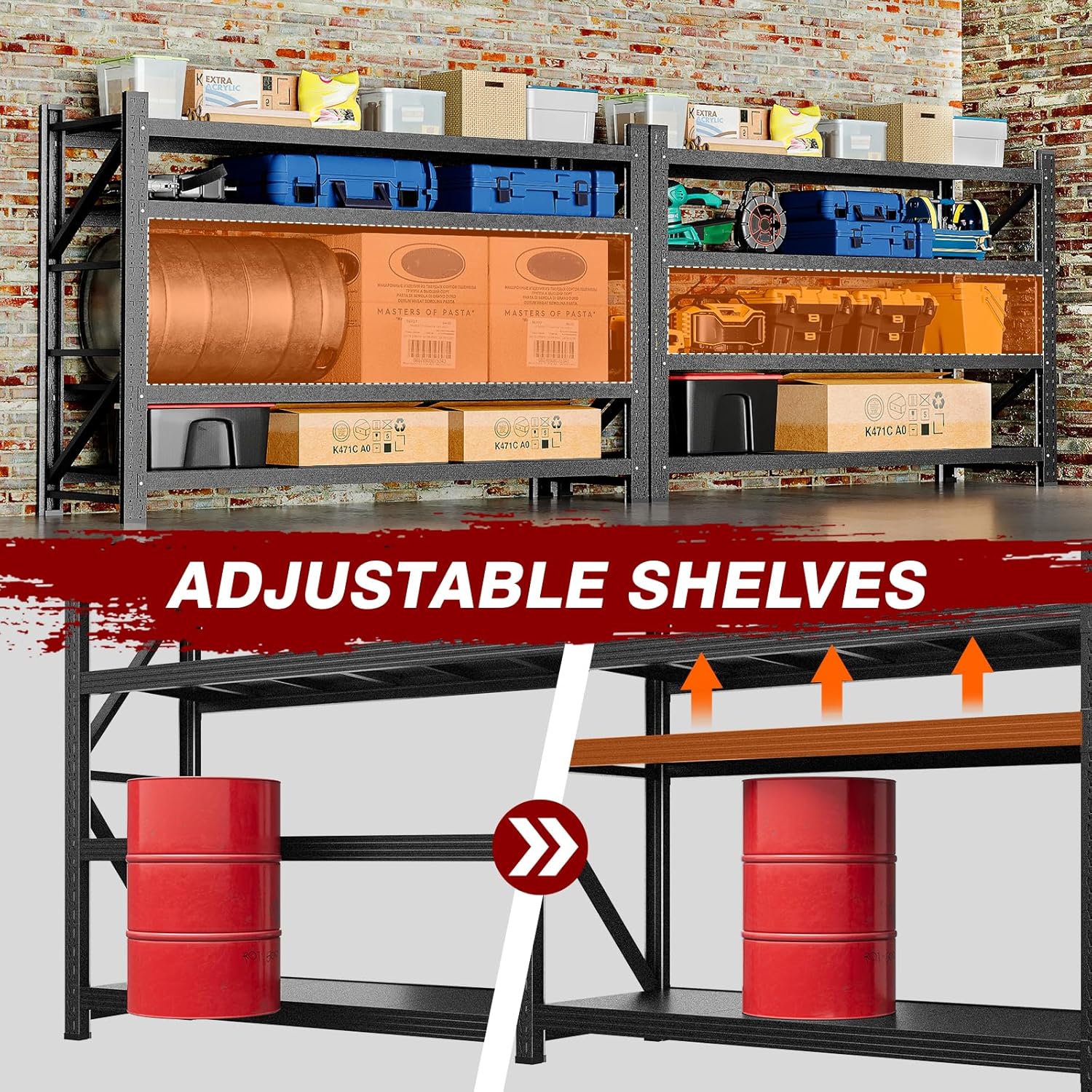 - ใ9000 Pounds Weight Capacity Garage ShelvingใMaximum load capacity of this heavy-duty industrial garage shelf reaches 9000 pounds. It features a robust metal frame with reinforced metal legs. Crafted using high-quality metal craftsmanship, each shelf layer is made of reinforced metal materials and equipped with thickened ribs at the base. This design ensures the shelf is far sturdier and more durable than fragile wooden heavy-duty shelves, while also accommodating storage of significantly more items.