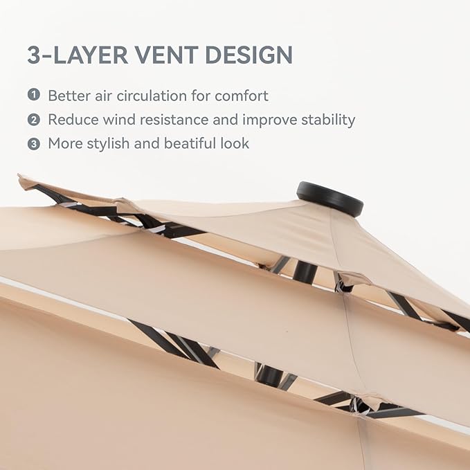 - Practical & Elegant Design: GREEN PARTY 10 ft patio umbrella with solar lights features a three-tier vented canopy that improves airflow for enhanced comfort and stability. The canopy of the outdoor umbrella is made from 100% polyester fabric, making it durable, waterproof, UV-resistant, fade-resistant, and easy to clean, ensuring years of reliable use