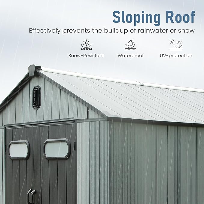 - Durable Double-Wall Resin Construction: Built with reinforced resin panels and interlocking wall connectors for enhanced durability, this shed resists warping, denting, and weather damage—ideal for year-round use.