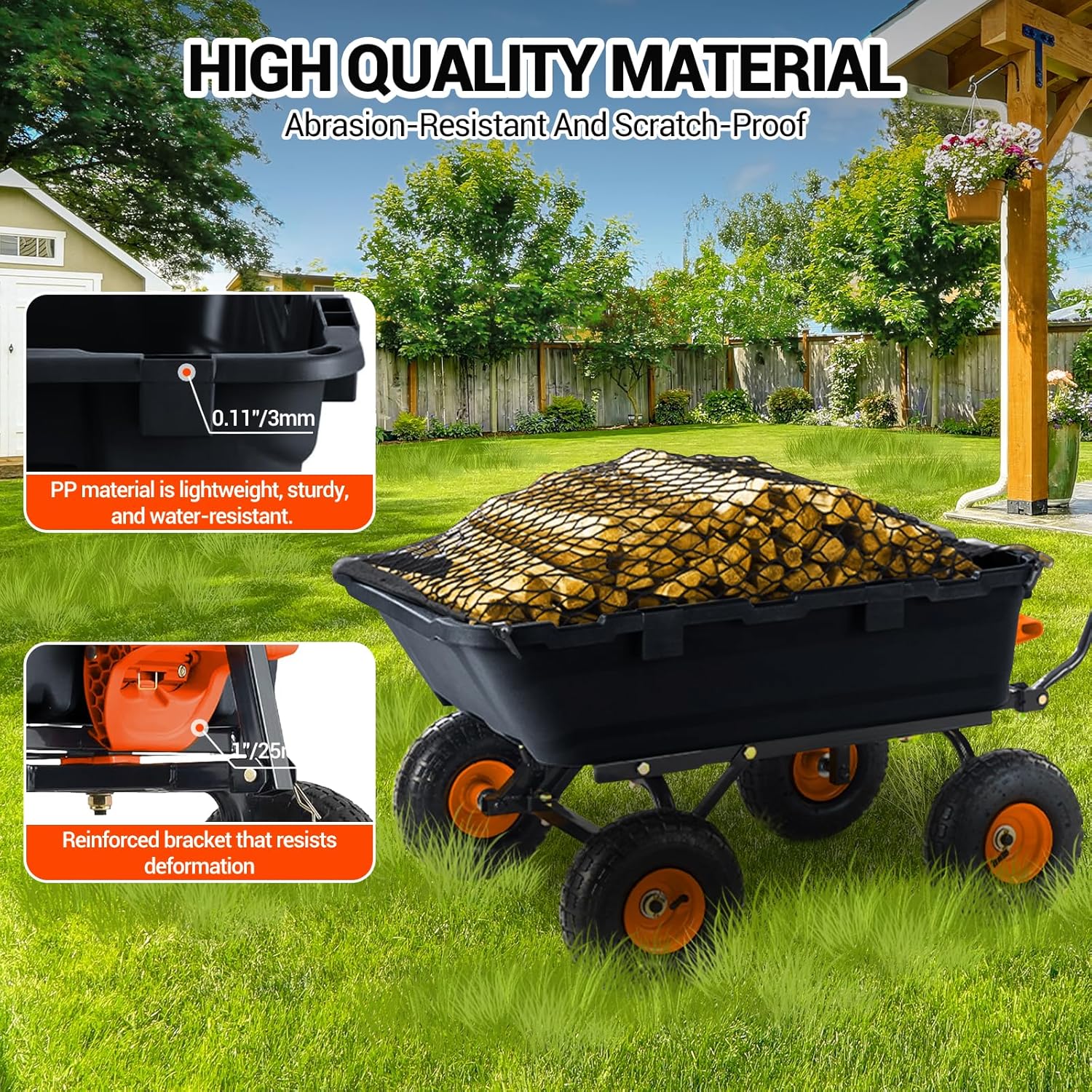 - SAFE AND SECURE TRANSPORT: Equipped with a mesh cover and cushioning, this yard dump cart protects your cargo during transit. It's versatile enough for use in gardens, orchards, farms, and warehouses, making it ideal for completing a wide range of transport tasks efficiently.