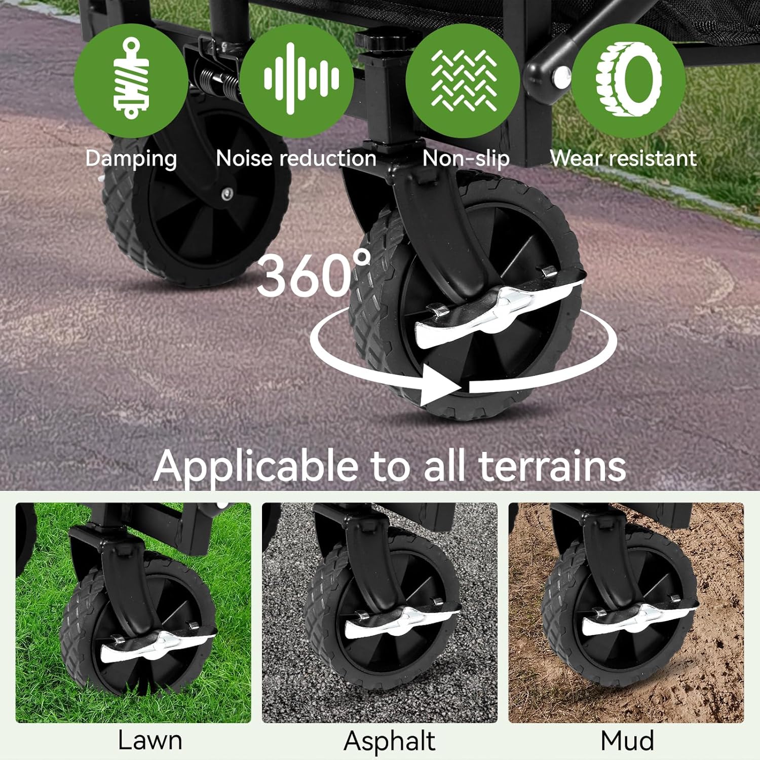 - High-quality materials & sturdy structure๏ผThis folding wagon cart features a reinforced steel frame and 600D waterproof Oxford fabric for durability. Equipped with thickened springs and 360ยฐ rotating front wheels with brakes, it offers easy maneuverability on any terrain, making it a reliable all terrain wagon.The tires and Oxford cloth are designed to be detachable, making cleaning and storage a breeze