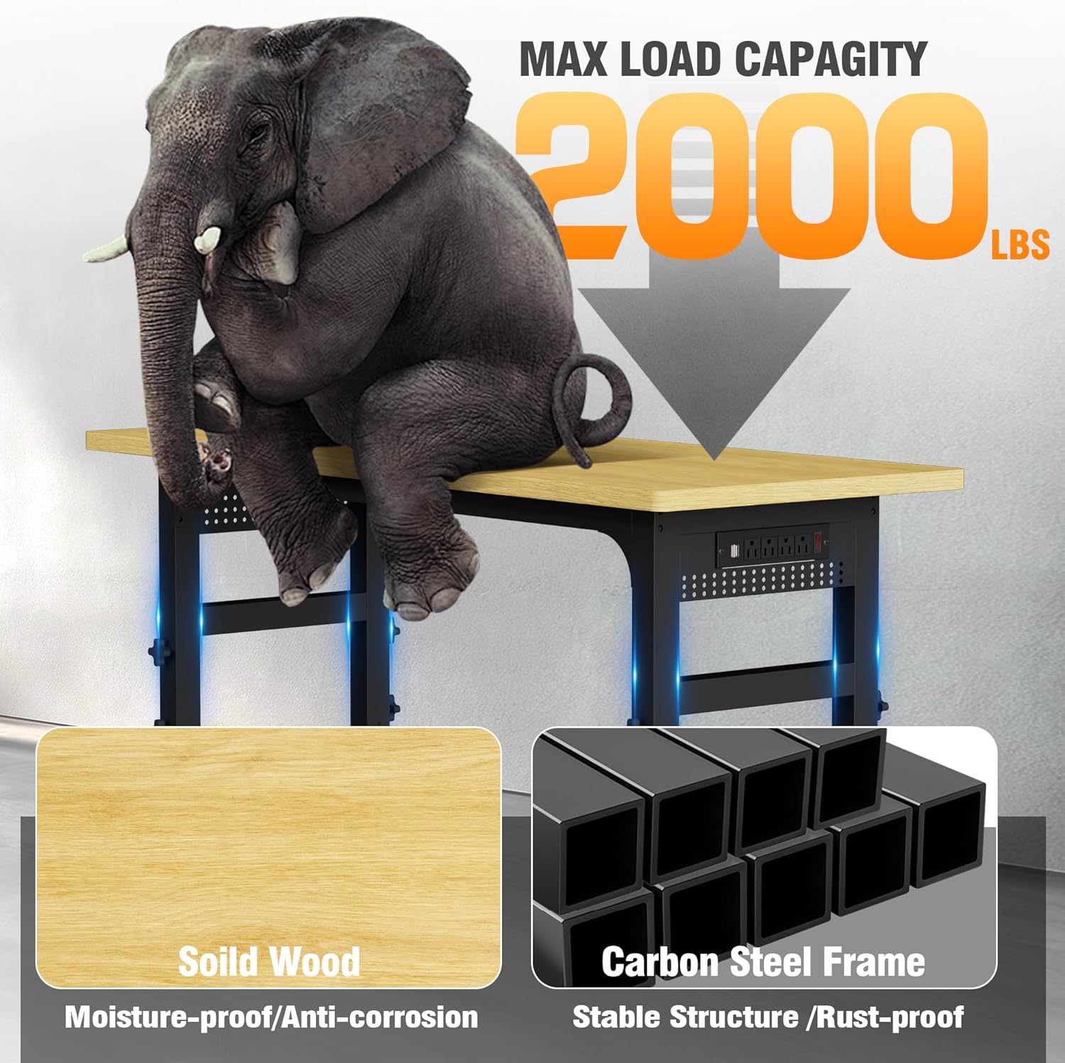 - Heavy-Duty and Durable Construction: The table top of this heavy duty workbench is made of solid wood and finely polished to prevent cracking, the legs and additional support rods are made of reinforced carbon steel with a weight capacity of over 2000 lbs