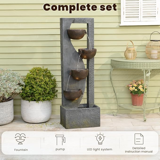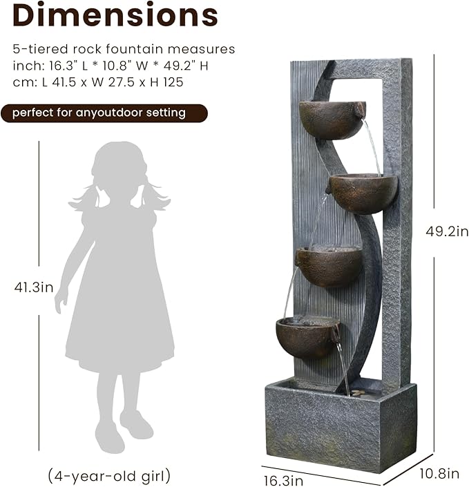 - π 5-Tier Cascading Waterfall Design: Experience serene ambiance with this outdoor waterfall fountain featuring five gently cascading tiers, mimicking natural stone textures for an elegant garden fountain centerpiece.