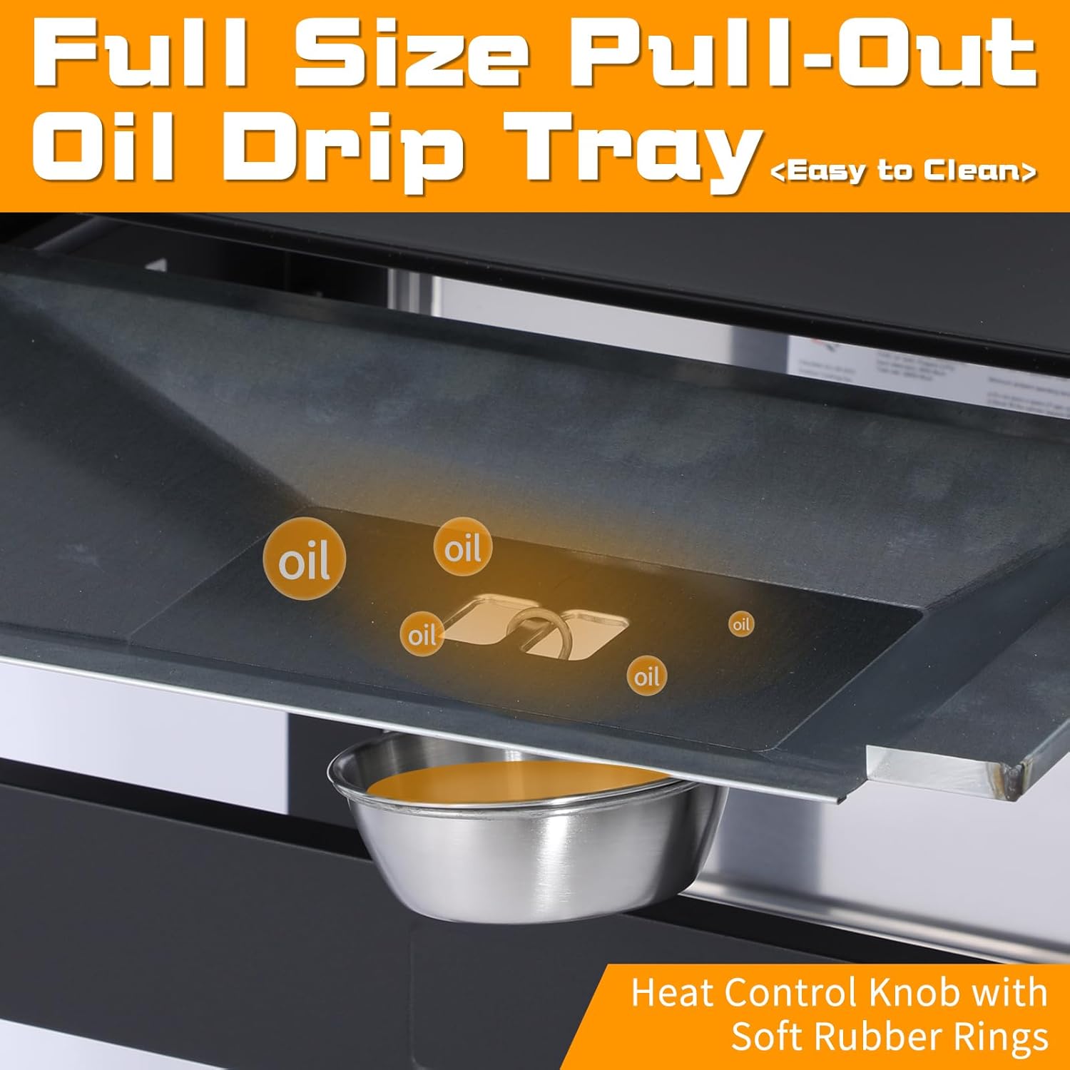 - Professional Multi-Functional BBQ Grill with Space-Saving Design:The three burner gas grill each side with a foldable table and two hooks,plus the built-in condiment bottle holder,provide extra workspace while conveniently place food,grilling utensils,or small accessories within easy reach,even adding a built-in bottle opener thoughtfully.The pull-out grease tray and stainless steel oil collection cup efficiently capture excess grease, ensuring optimal flavor retention during cooking while enabling quick and effortless cleanup for a more enjoyable grilling experience.