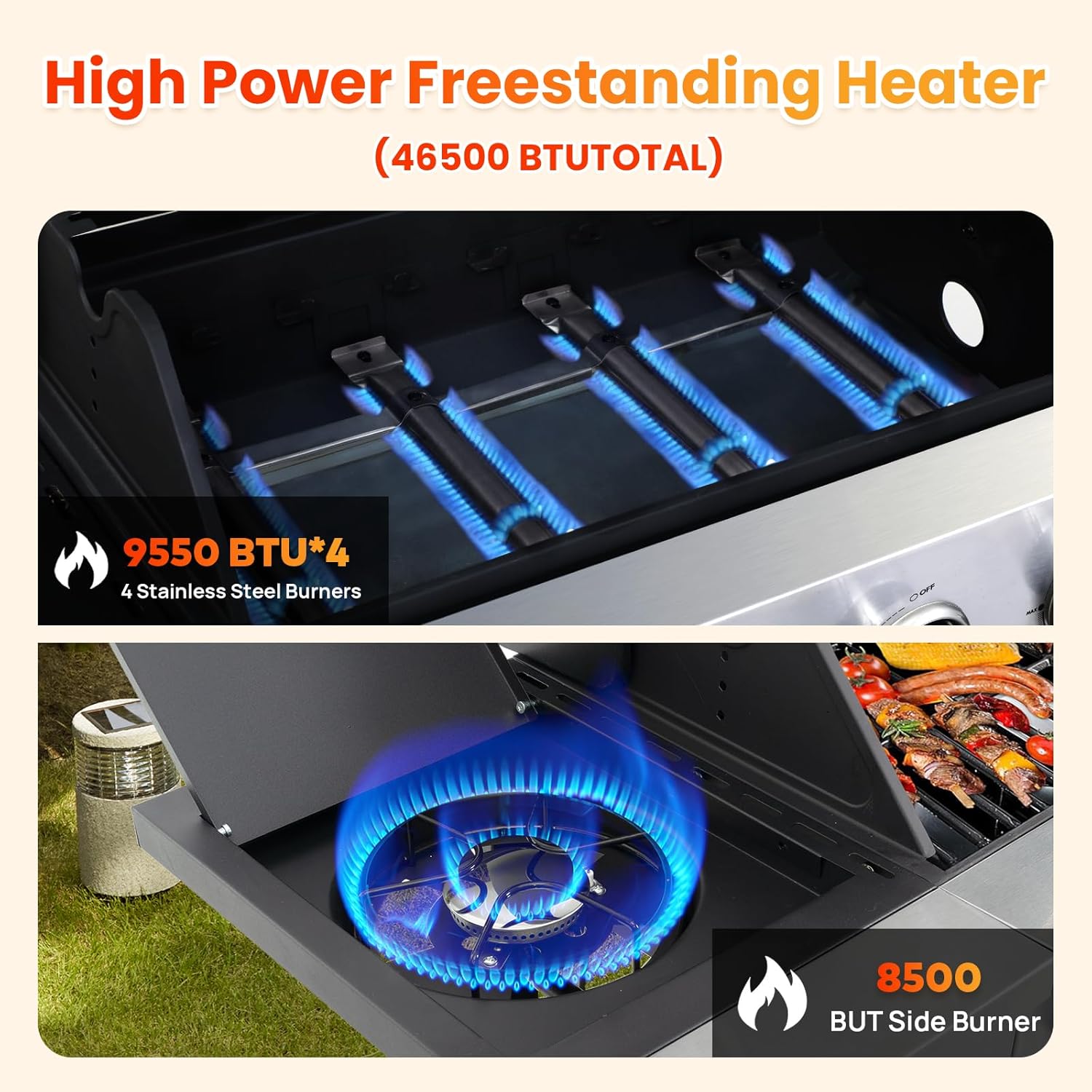 - π₯ High-Performance Stainless Steel Burners - This propane gas grill features 4 powerful stainless steel burners and side burner delivering a total of 46,500 BTU per hour. With a built-in piezoelectric ignition system, you can enjoy instant start-upβjust push and turn the control knob. Itβs reliable, efficient, and ready to fire up your outdoor meals in seconds.