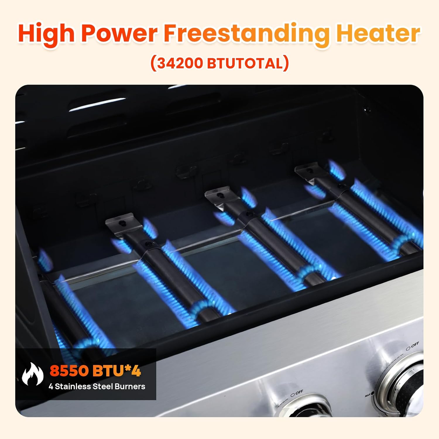 - π₯ High-Performance Stainless Steel Burners - This propane gas grill features 4 powerful stainless steel burners delivering a total of 34,200 BTU per hour. With a built-in piezoelectric ignition system, you can enjoy instant start-upβjust push and turn the control knob. Itβs reliable, efficient, and ready to fire up your outdoor meals in seconds.