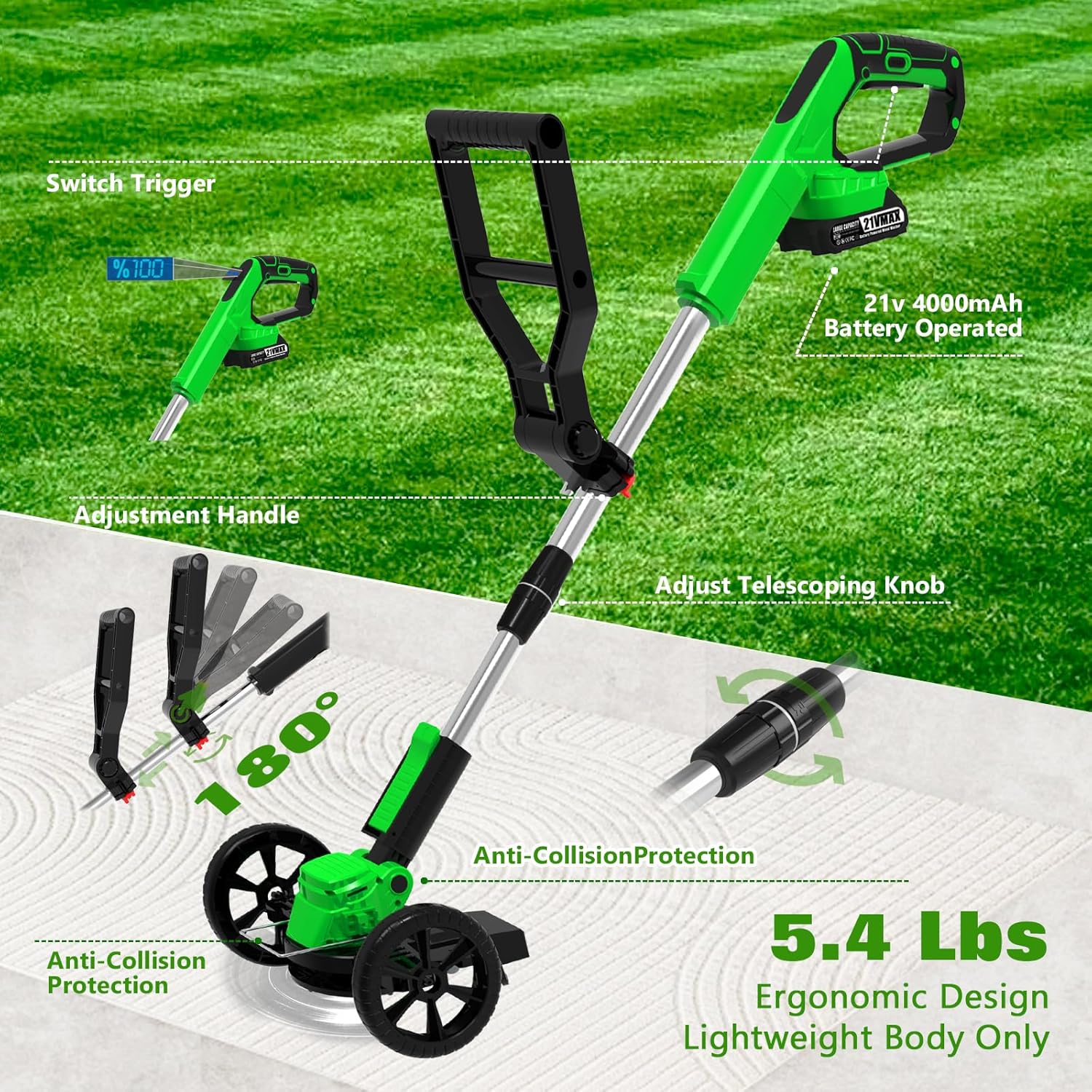 - 【2025 New Upgraded Electric Weed Trimmer】The cordless weed wacker has an upgraded 30cm extended directional handle and a digital power display, transverse/lateral wheels. And it is 25cm longer than the old stringless trimmer, so you can trim without bending over, effectively reducing back strain. And we also come with a weed puller tool, so you can solve the trouble of weeds at one time. Make your lawn and garden perfect and tidy, so that you can face the beginning of each day with a happy mood