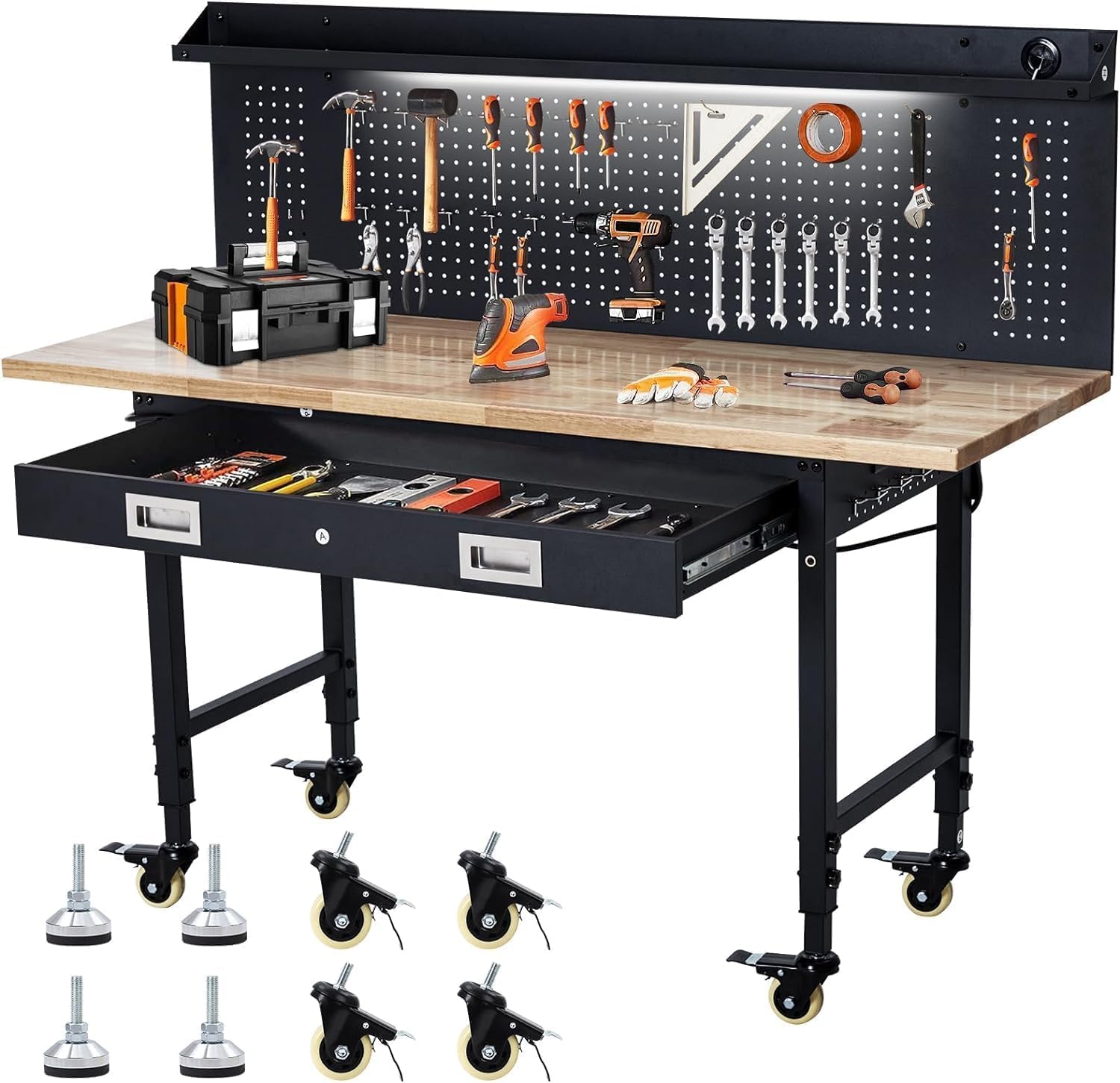 60-Inch Garage Workbench with Wheels, Adjustable Rubber Wood Top Garage Workbench with Pegboard & Drawer & Power Outlet, 2000 lbs Load Capacity, for Workshop, Woodworking, Office