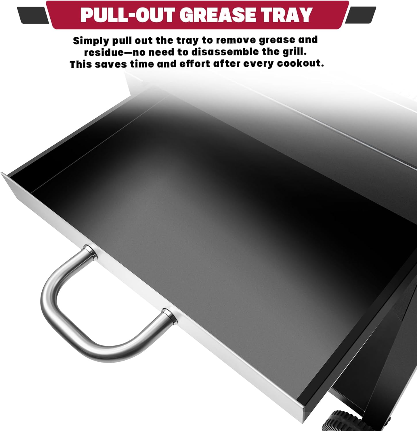 - Easy-Clean Pull-Out Grease Tray for Hassle-Free Maintenance: This charcoal grill features a convenient pull-out grease tray that catches excess oil and drippings during cooking. Designed for quick removal and easy cleaning, the tray helps reduce flare-ups, keeps your grill cleaner, and extends the life of your grill. No more tipping or awkward scrubbingโjust slide it out, empty, and you're ready for your next BBQ session.