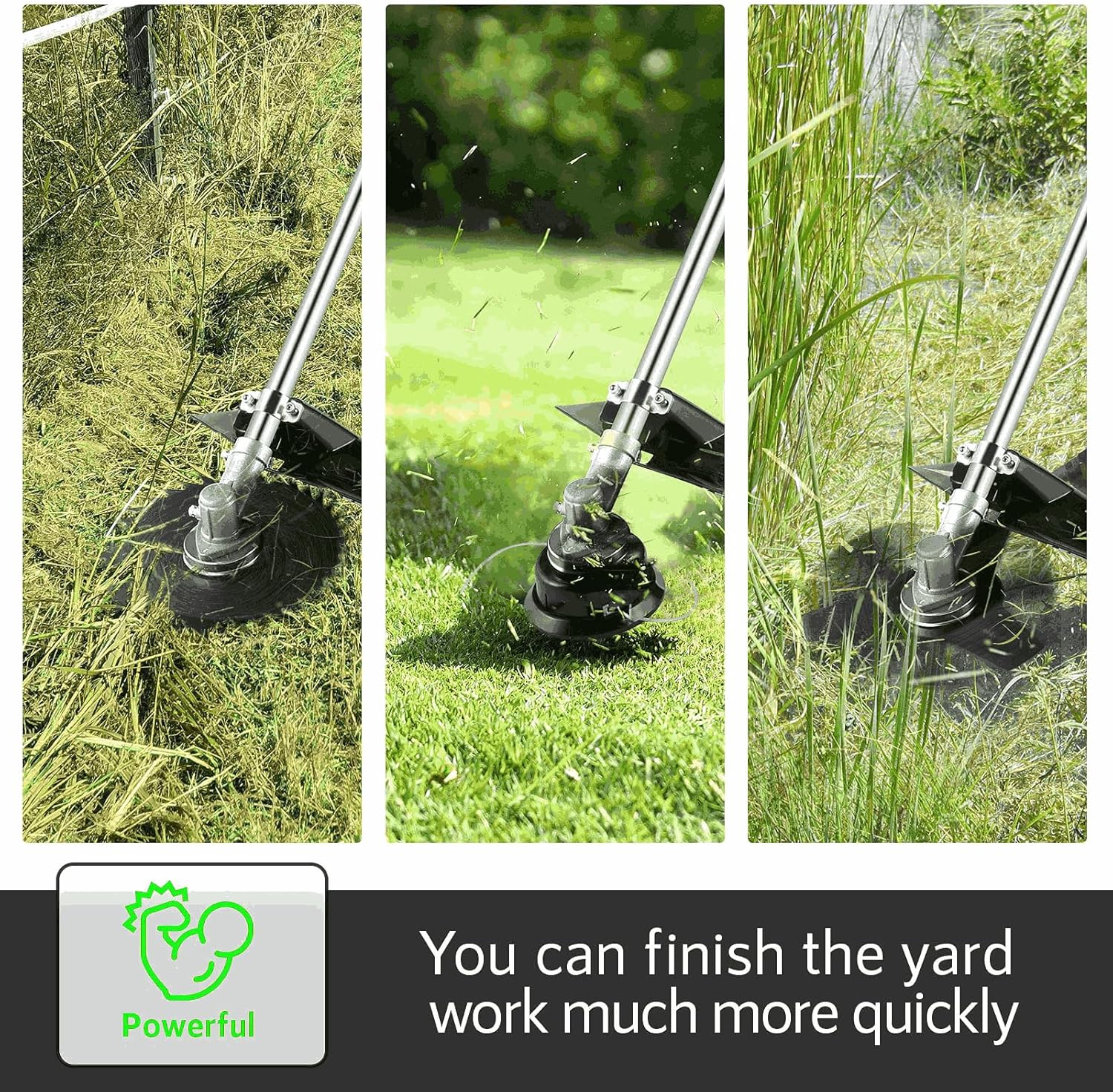 - 【4-In-1 Detachable Trimming Heads】Brush cutter equipped with 4 trimming heads, easily convert from 4T blade to 3T blade or dual thread head. 0.09" dual line head is intended to cut lawn & tender grass; 3T blade/saw blade brush cutter to power through weed and small shrub vegetation or withered grass, ect. A 10-inch cutting path can help quickly mowing bush, thicker shrub grass, sapling or vegetation.