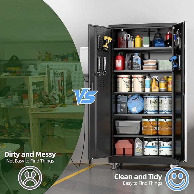 - 【Utility Pegboard & 5 Adjustable Shelves 】Redesign your organizing ways, hang up everything on the door, get effortless accessible for a variety of small hardware, no more searching for things among the clutter. Tall garage storage cabinet with wheels is designed with 5 adjustable shelves, you can easily meet your different storage needs by adjusting the height between the shelves.