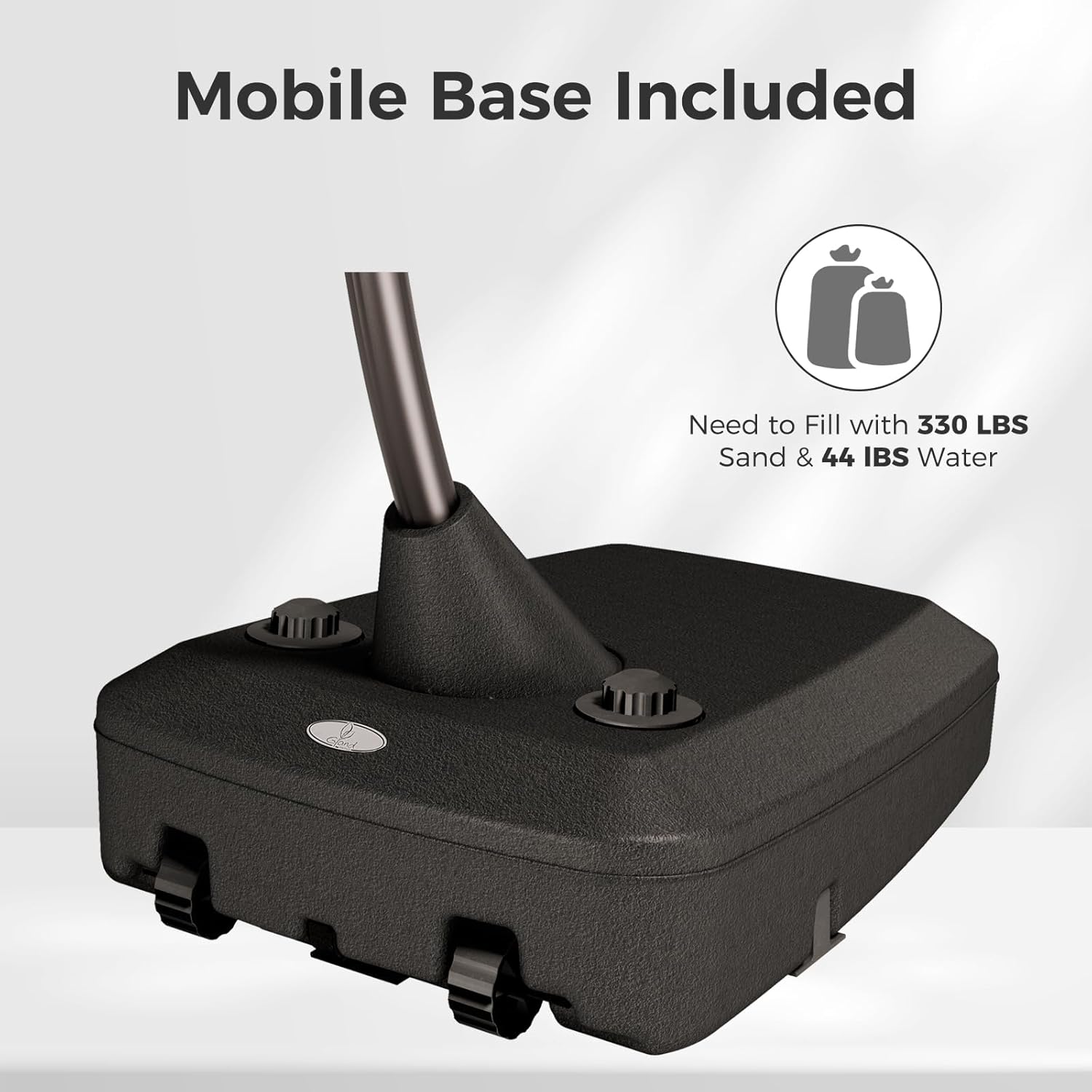 - STABILITY BASE WITH WHEELS: The outside umbrella has wheels for easy movement, in order to safely secure your umbrella, the base must be filled with 330 lbs sand and 44 lbs water, 374 lbs in total. Because of the risks of bad weather, it is best to close your umbrella into the deadlock position when you are not using it