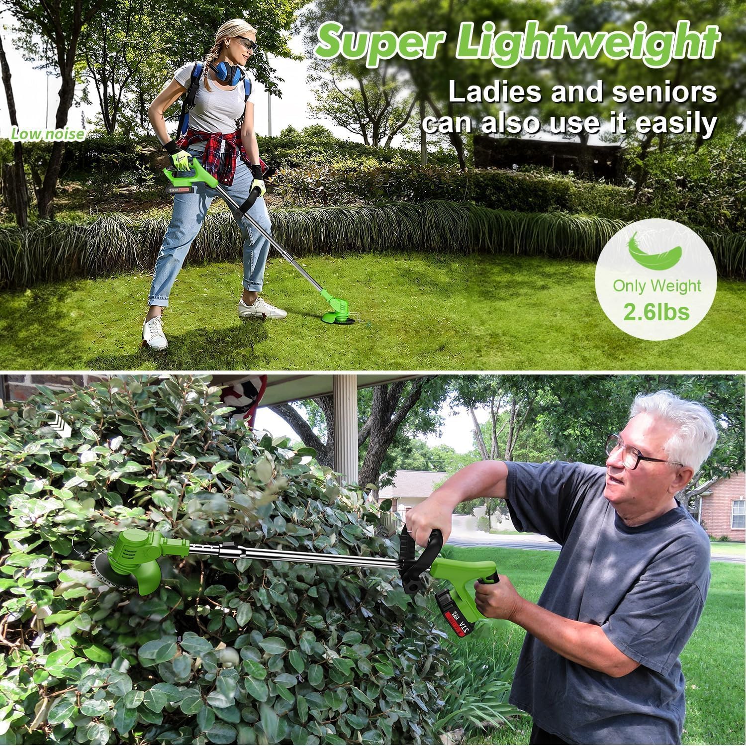 - Embrace an eco-friendlier way:This cordless electric weed eater produces zero direct emissions, unlike gas-powered models that release harmful fumes into the air you breathe.it's also about simplicity.The efficient electric motor requires minimal maintenance compared to finicky gas engines that need regular spark plug changes, air filter cleanings, and carburetor adjustments. Just pop in a charged battery, and you're ready to go.