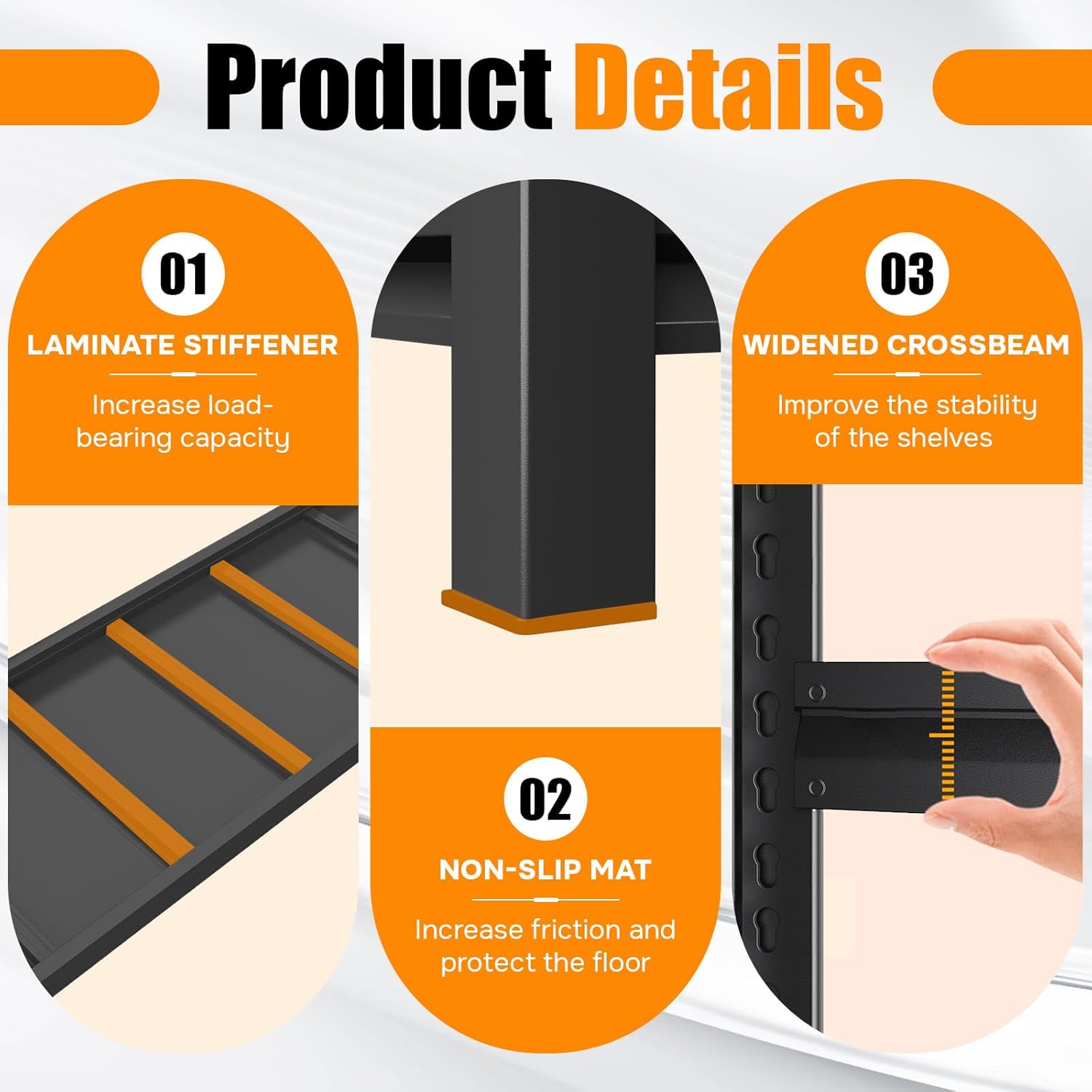 - Upgraded Double-Layer Columns and Reinforced Beams: Unlike ordinary garage shelves on the market that use single-layer columns, our product features upgraded double-layer columns. Double-layered columns and reinforced beams ensure these garage shelves are exceptionally stable. Thanks to a scientifically engineered frame structure, weight is distributed effectivelyโeliminating concerns about shelving shifting or boards warping